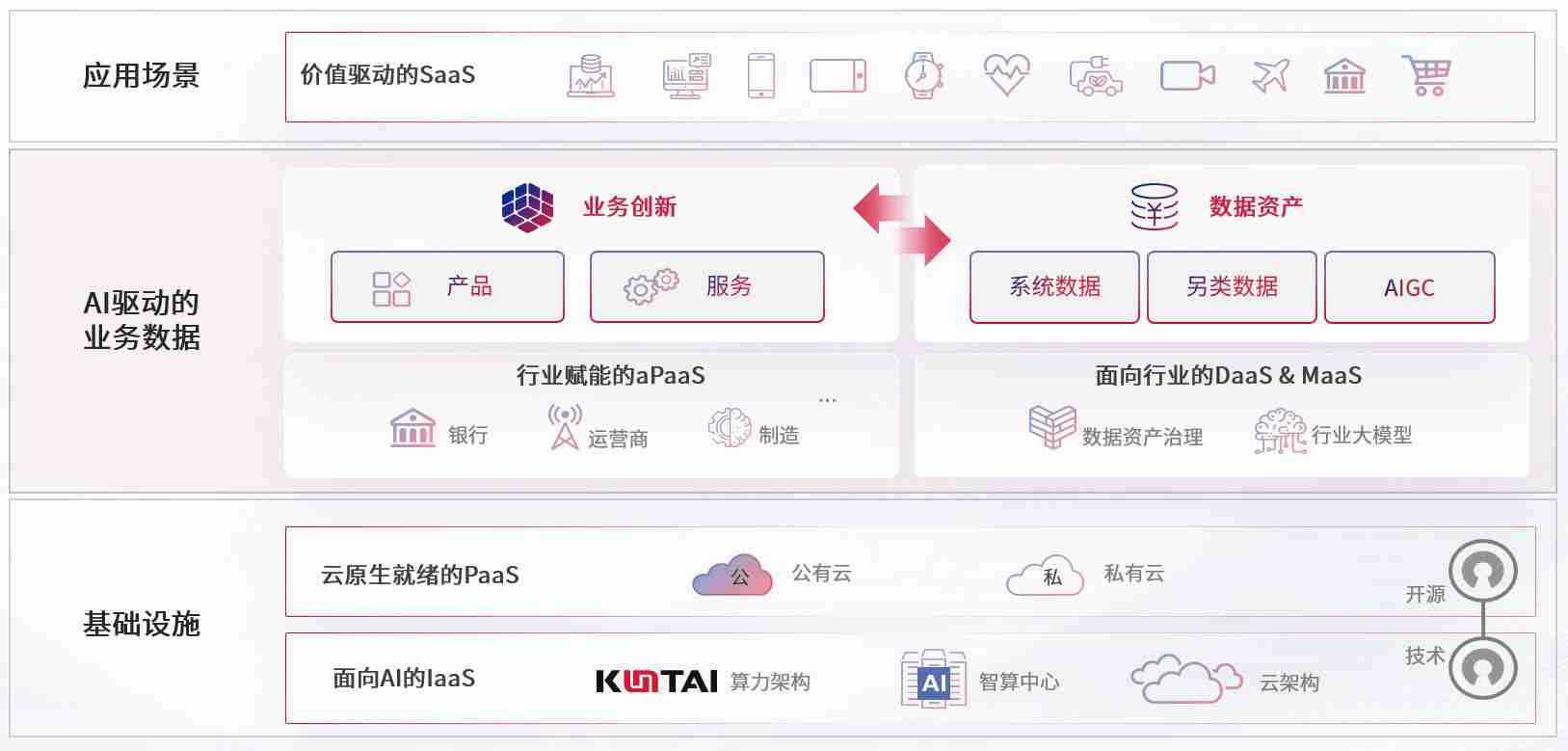 数字时代,,,围绕企业数字化转型的关键要素,,,尊龙z6数码开创性的提出数云融合战略和技术体系框架,,,,着力在云原生、、、数字原生、、AI原生和信创产业上架构产品和服务能力,,,,为处在不同数字化转型阶段的快消零售、、、、汽车、、、、金融、、、医疗、、政企、、教育、、、运营商等行业客户提供泛在的敏捷IT能力和融合的数据驱动能力,,,构建跨界融合创新的数字业务场景和新业务模式,,,助力企业级客户建立面向未来的核心能力和竞争优势,,全面推动社会的数字化、、智能化转型升级。。